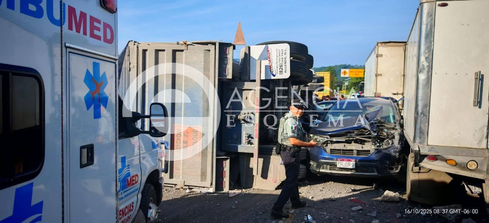 Fue precisamente este accidente el que provocó que el conductor de un tractocamión frenara de manera sorpresiva, por lo que un vehículo compacto Kia, color rojo se estrelló en la retaguardia y éste a su vez fue impactado por otro tractocamión de la empresa Carga Super Express, con placas 17-UY-2D.