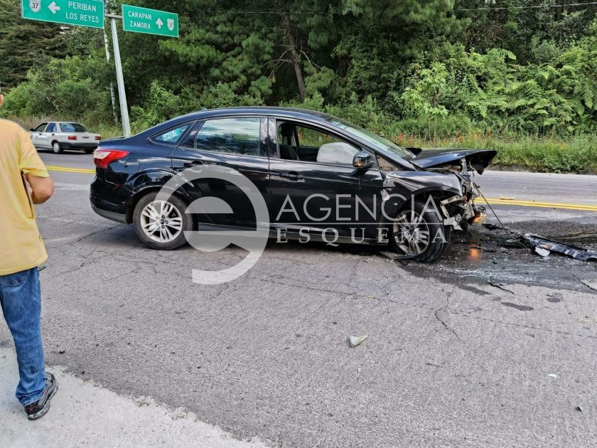 Uruapan, Michoacán, 14 de octubre de 2025.- Un choque de frente entre dos vehículos compactos dejó un saldo de al menos 3 lesionados, la tarde de este martes sobre la carretera Uruapan-Paracho, a la altura de la desviación a Los Reyes.