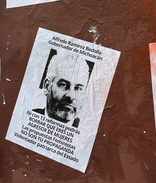 A lo largo de la avenida Madero, las manifestantes pegaron carteles con la imagen del mandatario y mensajes de protesta, donde se leía: «Ni con 13 reformas podrás borrar que eres un agresor de mujeres», «Las propuestas feministas son tu propaganda», y «Violentador, patriarca del Estado».