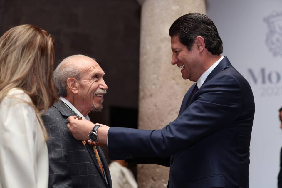 Morelia, Michoacán; 18 de mayo de 2023.- Por su destacada trayectoria y gran distingo en las artes y en las ciencias, así como por sus elevadas virtudes cívicas que han honrado a lo largo del tiempo a la Ciudad de Morelia, al estado y la nación, el presidente Alfonso Martínez Alcázar, entregó la Presea “Generalísimo Morelos”, en el marco del 482 aniversario de la fundación de Morelia.