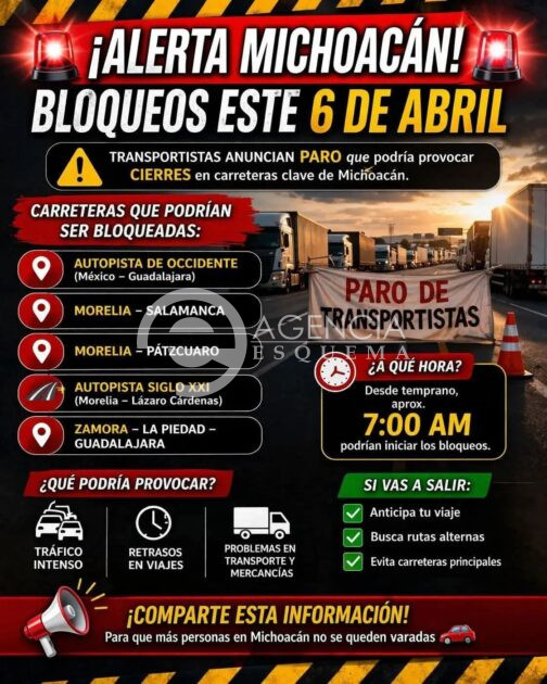 Michoacán, México, 05 de abril del 2026.-Cansados de la inseguridad en Autopistas y carreteras del país, así como de apoyos para los campos agrícolas, transportistas y campesinos anunciaron un mega bloqueo en gran parte de México este lunes 6 de abril a partir de las 07:00 horas.