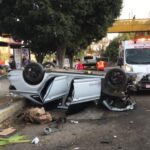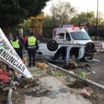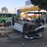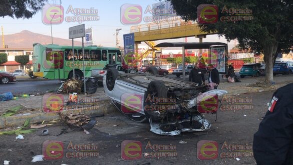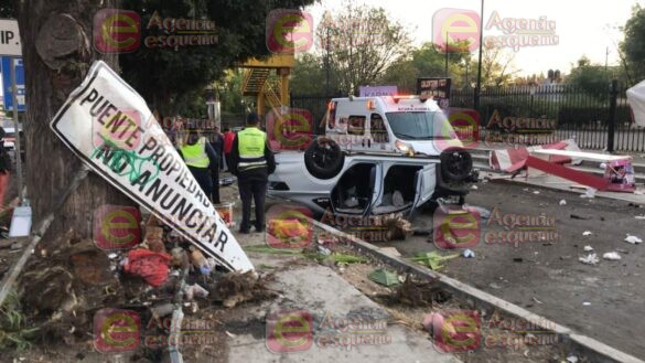 Autoridades informaron el vehículo compacto de color blanco circulaba a velocidad mayor de lo permitido, su operador perdió el control y chocó contra un poste para terminar volcado.