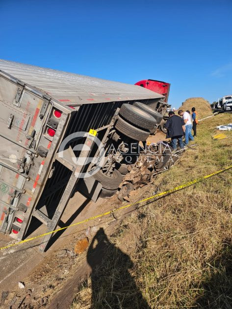 Maravatío, Michoacán, 22 de octubre del 2025.-Cuatro adultos y tres niños perdieron la vida trágicamente la tarde de ayer, cuando el taxi de Irimbo en que viajaban fue embestido y aplastado por un tráiler, sobre la carretera Atlacomulco-Guadalajara, dentro de la jurisdicción de este municipio de Maravatío, Michoacán.