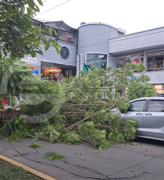 Uruapan, Michoacán, 30 de mayo de 2025.- Un enorme árbol se desplomó y aplastó dos vehículos estacionados en la zona de antros y restaurantes, sobre la avenida Latinoamericana, sin que por fortuna se registraran víctimas.