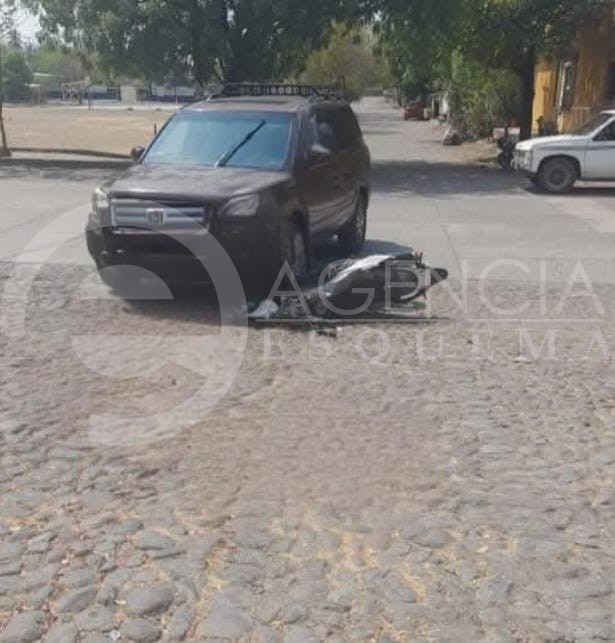 Apatzingán, Michoacán, 4 de mayo de 2025.- Este domingo se registró un accidente en la colonia Pénjamo, un motociclista fue arrollado por una camioneta que terminó sobre la motocicleta.