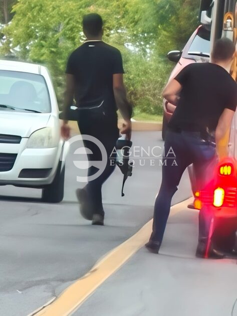 En otra imagen se aprecia a un sujeto cargando con su mano derecha un arma larga, en plena vía de circulación, viste playera negra y pantalón azul, mientras que otro, con el mismo color de ropa maniobra las palancas para desenmascarar los vehículos, y otros de sus cómplices se ven en la parte superior de la Nodriza.