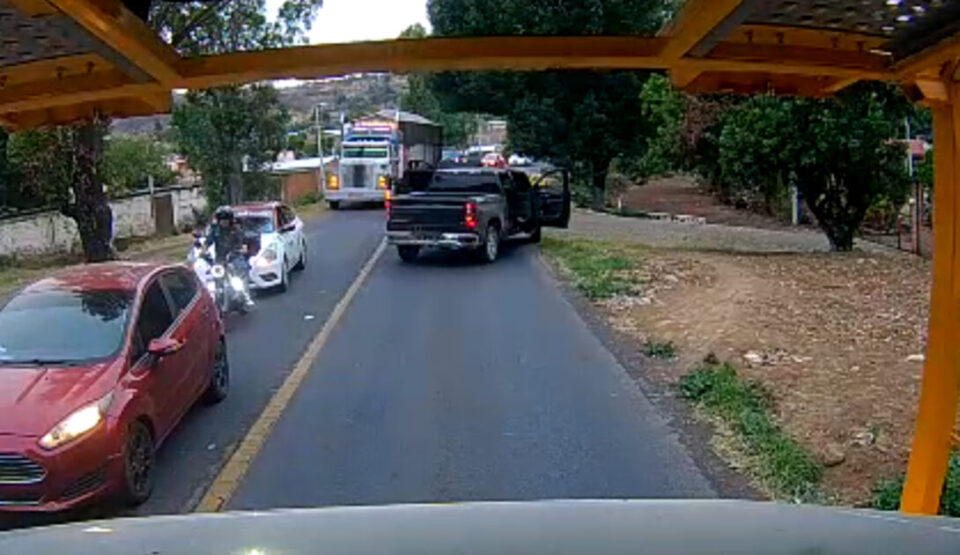 Chilchota, Michoacán, 17 de abril del 2026.- Cámaras de video grabación captan el momento exacto en que un comando armado intercepta a una Nodriza y se roba los vehículos qué transportaba.