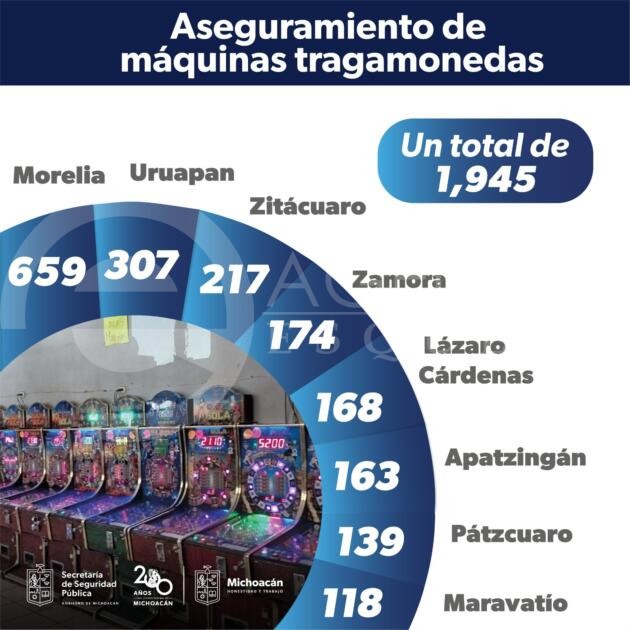 En lo que va del año, las acciones efectuadas en las ocho regiones del estado han permitido asegurar mil 945 aparatos, precisó el secretario de Seguridad Pública, Juan Carlos Oseguera Cortés, quien detalló que 659 máquinas corresponden a Morelia,307 en Uruapan, 217 en Zitácuaro, 174 en Zamora, 168 en Lázaro Cárdenas; 163 en Apatzingán; 139 en Pátzcuaro y 118 en Maravatío.