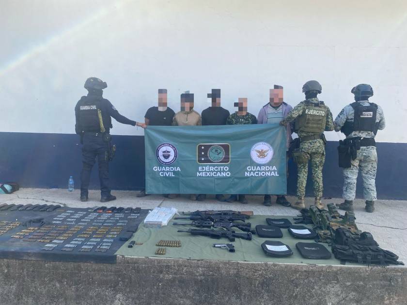 Apatzingán, Michoacán, 06 de marzo del 2025.- Elementos de las secretarías de Seguridad Pública (SSP) y de la Defensa Nacional (Defensa), efectuaron el aseguramiento de cinco personas del sexo masculino en posesión de cuatro fusiles, una pistola y 2 mil 141 cartuchos útiles.