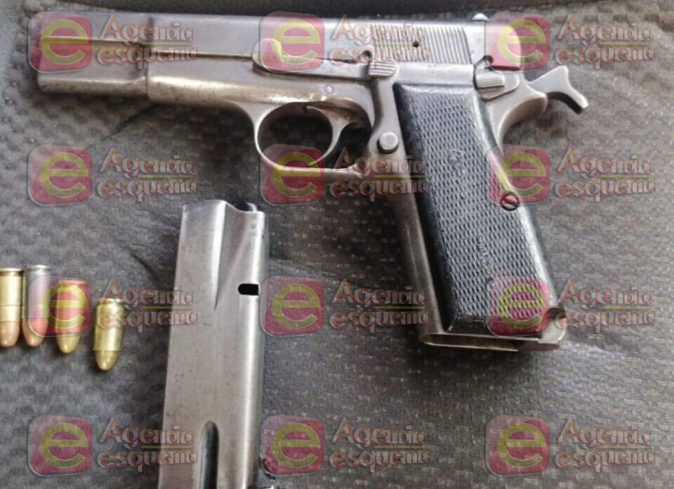 Ello, llamó la atención del personal de la Dirección de Seguridad Pública Municipal, procediendo a marcarle el alto y a efectuarle una revisión, encontrándole fajada en la cintura una pistola calibre .9 milímetros abastecida con cinco cartuchos útiles.
