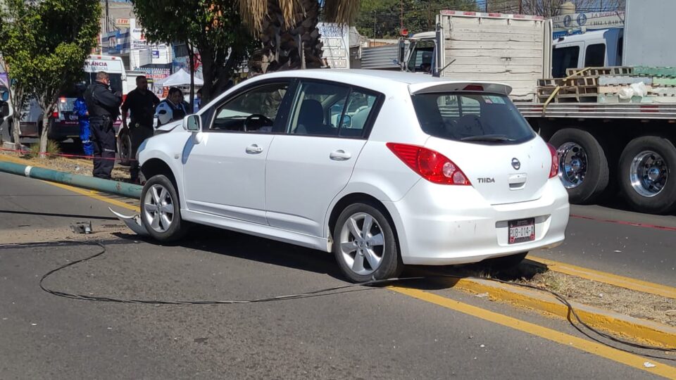 Morelia, Mich.-21 de enero del 2023.-Poco después de las 12:00 horas un automóvil conducido por un hombre de la tercera edad, derribó un poste de una luminaria sobre el Periférico a la entrada a la colonia Manantiales.