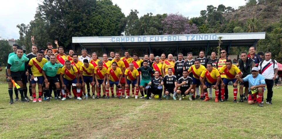 Nuevo Parangaricutiro, Michoacán, 12 de enero de 2026.- El juego de leyendas del Atlético Morelia contra un combinado local, en la cancha Tzindio, se llevó a cabo en medio de un gran ambiente y convivencia familiar. Los Canarios, una pléyade de jugadores de la mejor época del futbol profesional de la capital del estado.