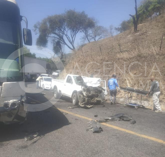 Uruapan, Michoacán, 22 de marzo de 2025.- Dos personas que viajaban en una camioneta resultaron lesionadas de consideración tras chocar contra un autobús de pasajeros sobre la carretera Uruapan-Lombardía, accidente registrado la tarde de este sábado.