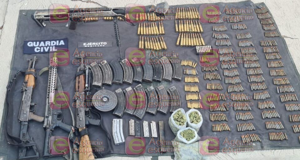 Además, les confiscaron 16 cargadores para arma larga 7.62×39 milímetros, 5 para pistola calibre .38 milímetros, uno para fusil .223, 79 cartuchos calibre .50, 43 .38 milímetros, 65 para arma 5.56 y 556 para “cuerno de chivo”.