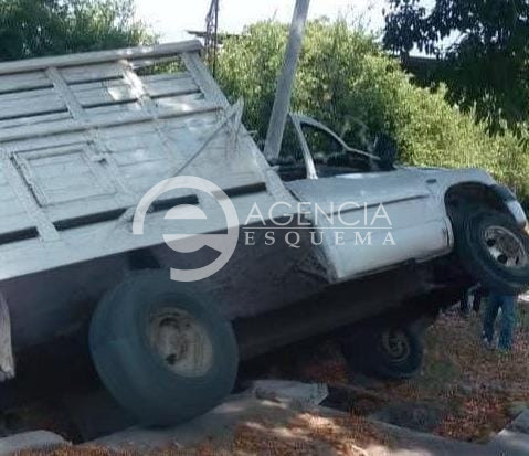 Parácuaro, Michoacán, 01 de diciembre del 2025.-La imprudencia al conducir provocó que la camioneta que llevaba cargada con cajas de limón cayera a un canal de aguas negras.
