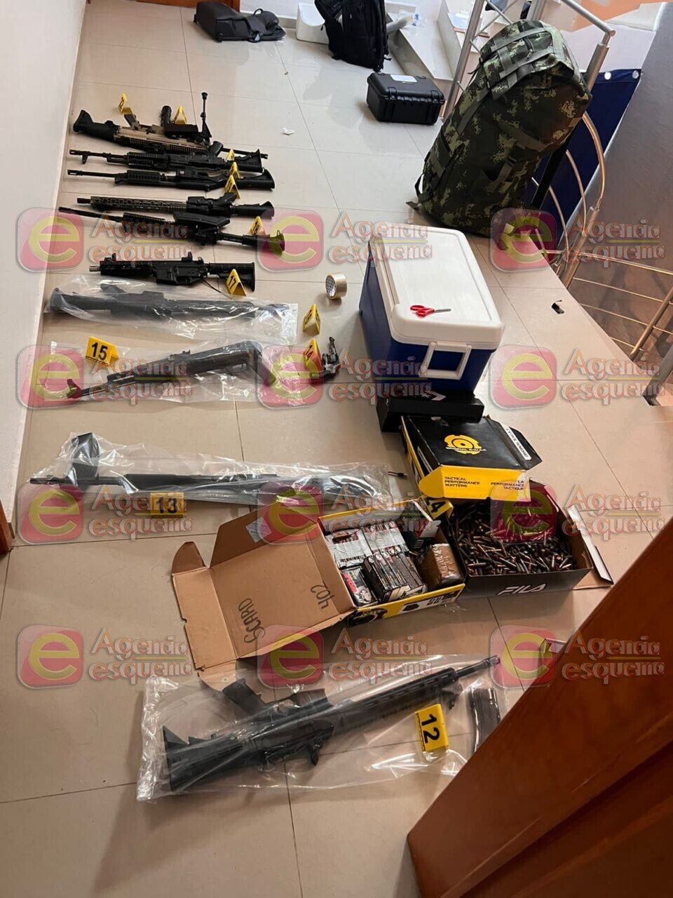 Una vez con el documento en su poder, la Fiscalía General de la República procedieron a catear dicha “Casa de Seguridad” y encontraron 10 armas largas entre AK-47, calibre 7.62×39 y AR-15 calibre .223 3 mil 924 cartuchos útiles, 9 chalecos antibalas, 5 básculas grameras,182 pipas con residuos de droga sintética “cristal”, diversas cantidades de mariguana distribuida en dos grandes paquetes forrados con cinta canela y 106 envoltorios de plástico, conteniendo “cristal”, 60 vapeadores, un dron y una motocicleta.