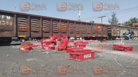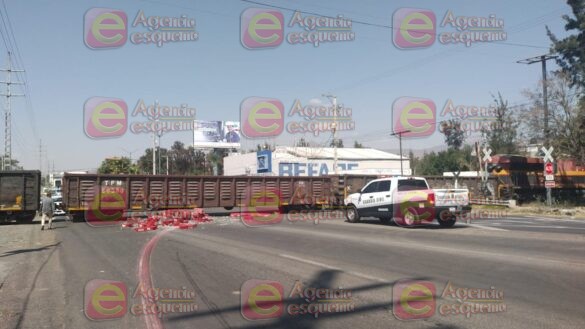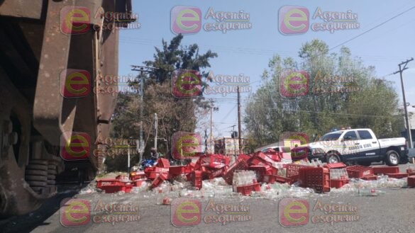 Morelia, Mich.-18 de febrero del 2023.-Nuevamente se registra un accidente en cruce ferroviario del Libramiento a la altura de la Secretaría de Seguridad Pública, ahora un camión de la Coca Cola se estrelló contra el muro de acero.