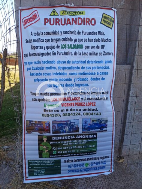 Puruándiro, Michoacán, 03 de marzo del 2026.- Nueve lonas colocadas en distintos puntos de este municipio, y con mensaje dirigido a la sociedad a manera de alertar por supuestos abusos del grupo élite del gobierno federal, “Murciélagos”, fueron puestas a disposición de la autoridad correspondiente.