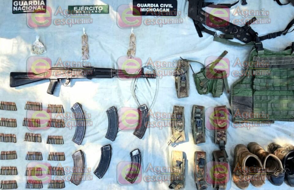 Al ir circulando por la calle Del Deporte, se percataron del abandono de dos motocicletas Italika, modelo y 2020 y 2018, colores negro con rojo y azul con blanco, respectivamente, así como un fusil calibre 7.62 X 39, seis cargadores, un chaleco porta placas, dos pares de botas tácticas y 7 porta cargadores y 40 gramos de mariguana.
