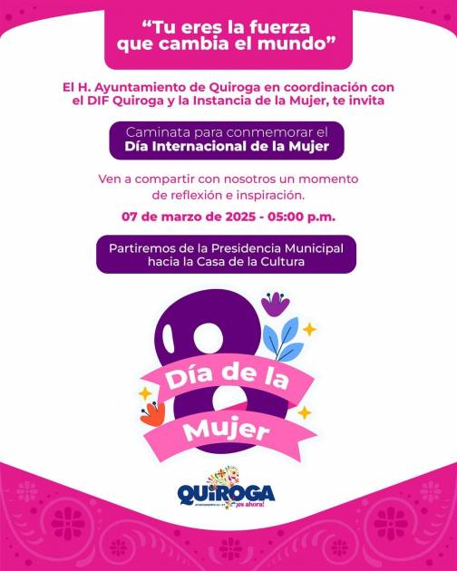 Quiroga, Michoacán, a 6 de marzo 2025 – En el marco del Día Internacional de la Mujer, el Gobierno de Quiroga, a través del Sistema para el Desarrollo Integral de la Familia (DIF) Municipal y la Instancia de la Mujer, invita a la ciudadanía a participar en una caminata de reflexión y empoderamiento, un evento que busca resaltar la importancia de la lucha por la igualdad de género y el reconocimiento de los derechos de las mujeres.