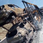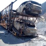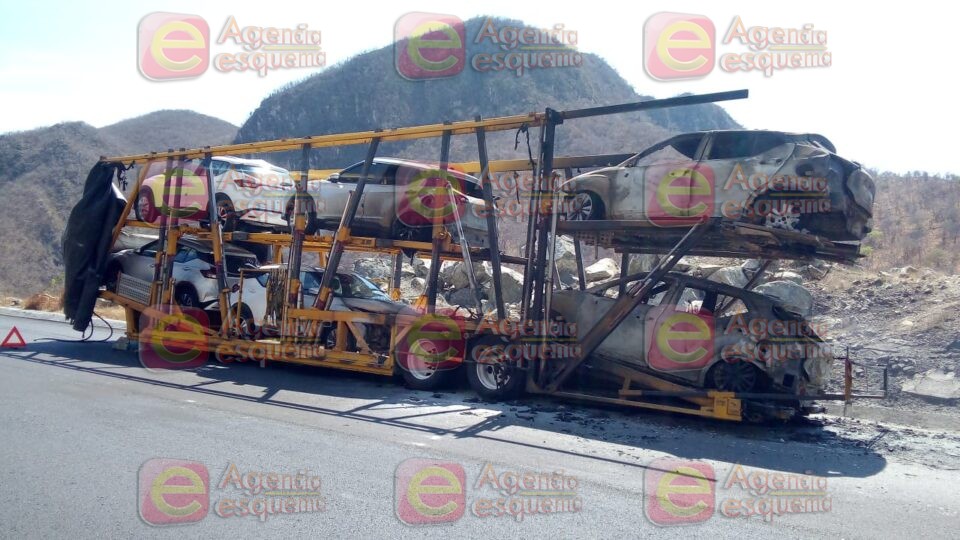 Lázaro Cárdenas, Michoacán.-27 de marzo del 2023.- Una Nodriza y al menos ocho vehículos que transportaba sobre la autopista Lázaro Cárdenas-Morelia, quedaron reducidos a cenizas cuando al parecer un corto circuito ocasionó el siniestro.