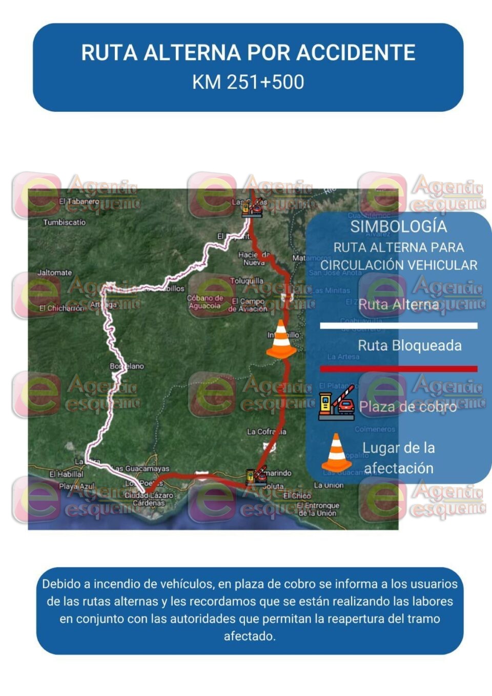 Ante ello, se informa que el tránsito hacia Lázaro Cárdenas, por recomendación de la Secretaría de Comunicaciones y Transportes, se ha desviado desde la caseta de Las Cañas hacia la carretera federal que conduce a Arteaga y posteriormente a la ciudad portuaria.