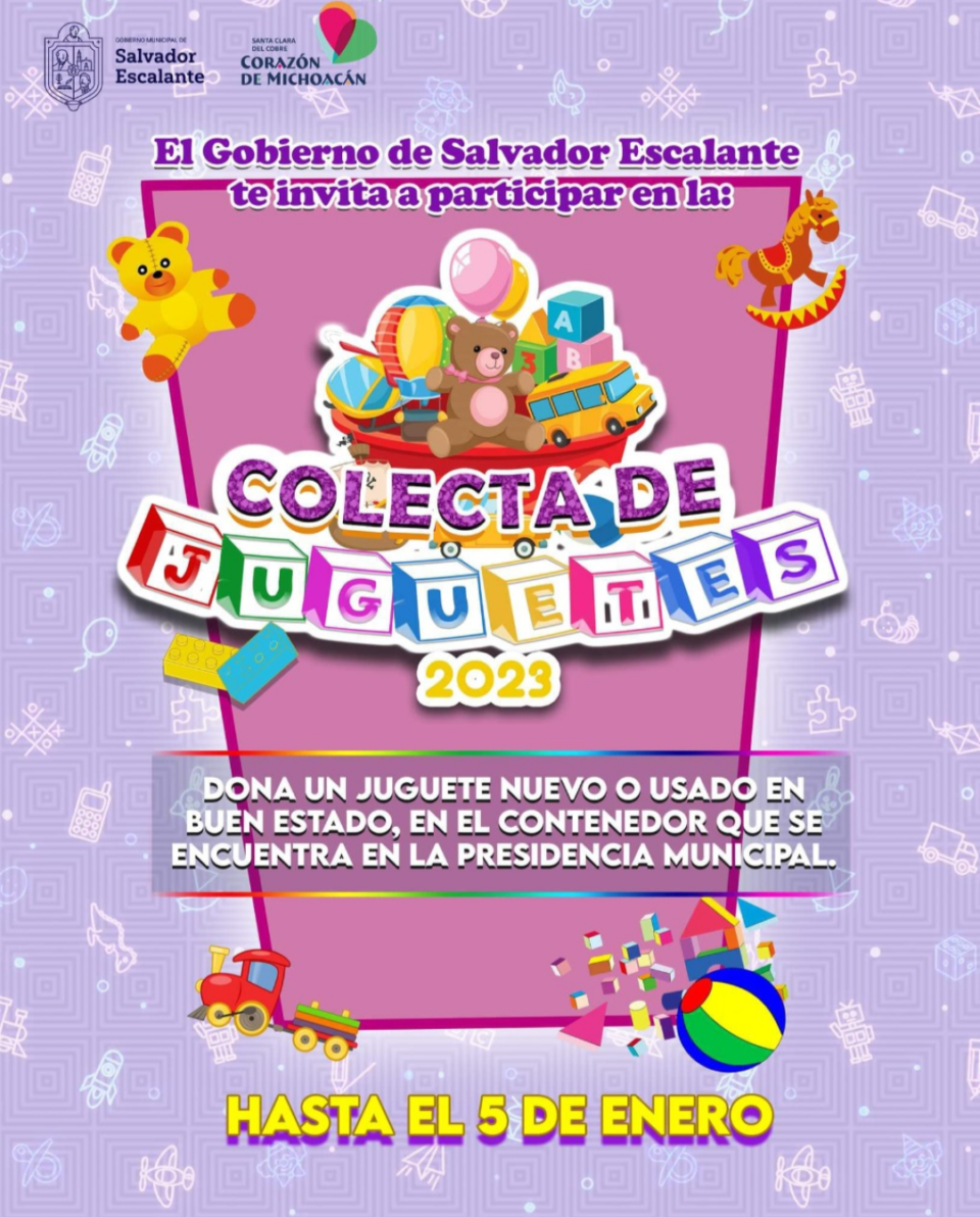 Salvador Escalante, Michoacán, a 2 de enero 2023.- Con el objetivo de entregar alegría y sonrisas a las niñas y niños del municipio de Salvador Escalante, el Ayuntamiento que encabeza Araceli Saucedo Reyes puso en marcha la Colecta de Juguetes 2023, a la cual invita a participar con la donación de algún juguete nuevo o usado en buen estado.