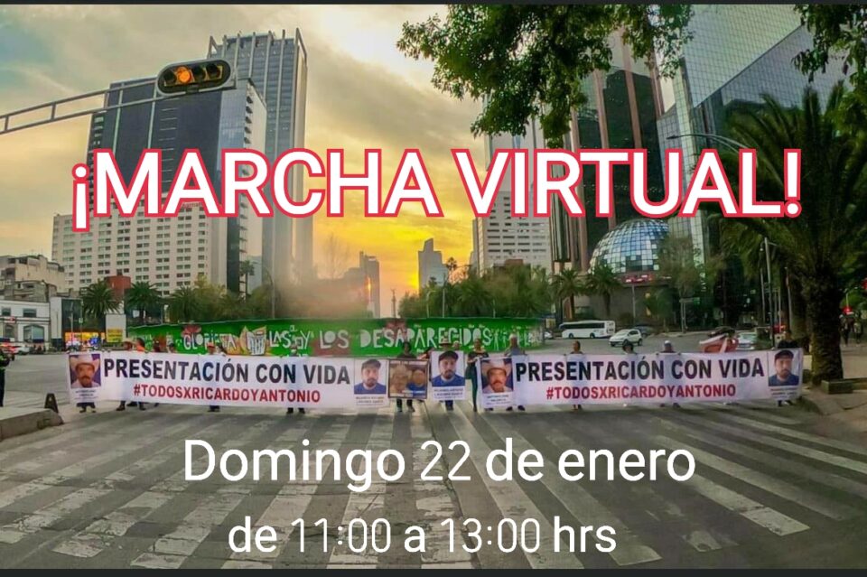 “Hagamos una ola de tweets y publicaciones en redes, durante la protesta presencial en la ciudad de México por la presentación con vida de Ricardo Lagunes y Antonio Díaz Valencia”. Dice el mensaje.