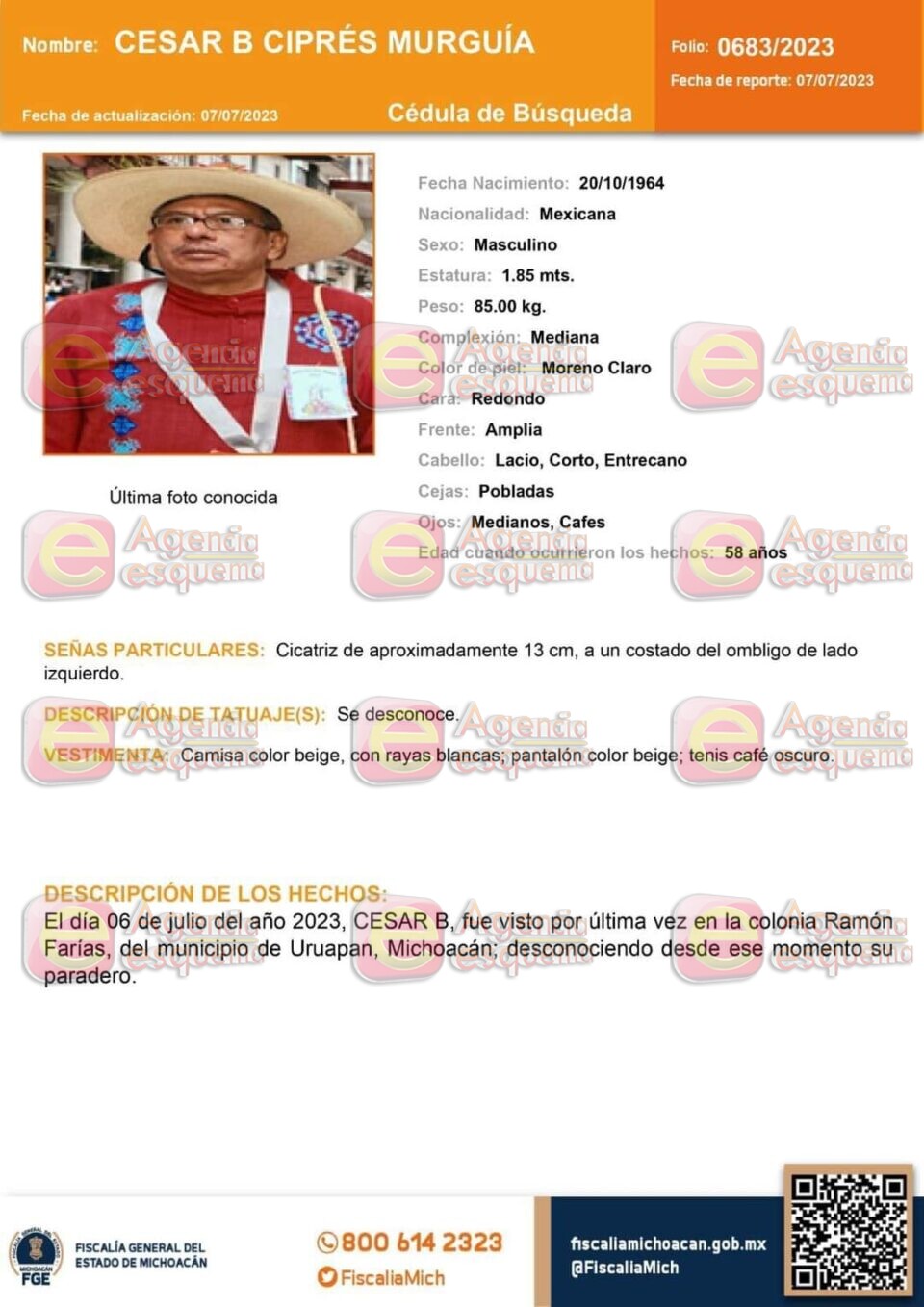 Uruapan, Michoacán.-07 de julio del 2023.-La Fiscalía del Estado emitió la ficha de búsqueda de César Ciprés Murguía, promotor cultural y trabajador del Ayuntamiento local, quien desapareció desde el día de ayer.