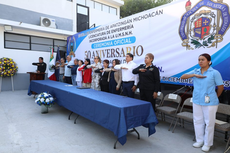 Querida comunidad de esta Escuela de Enfermería, añadió, que este aniversario de oro sirva para renovar nuestro pacto sagrado con la sociedad, sigan siendo ese ejército de paz vestidos de blanco, sigan cuidando Apatzingán con el orgullo de ser nicolaitas.