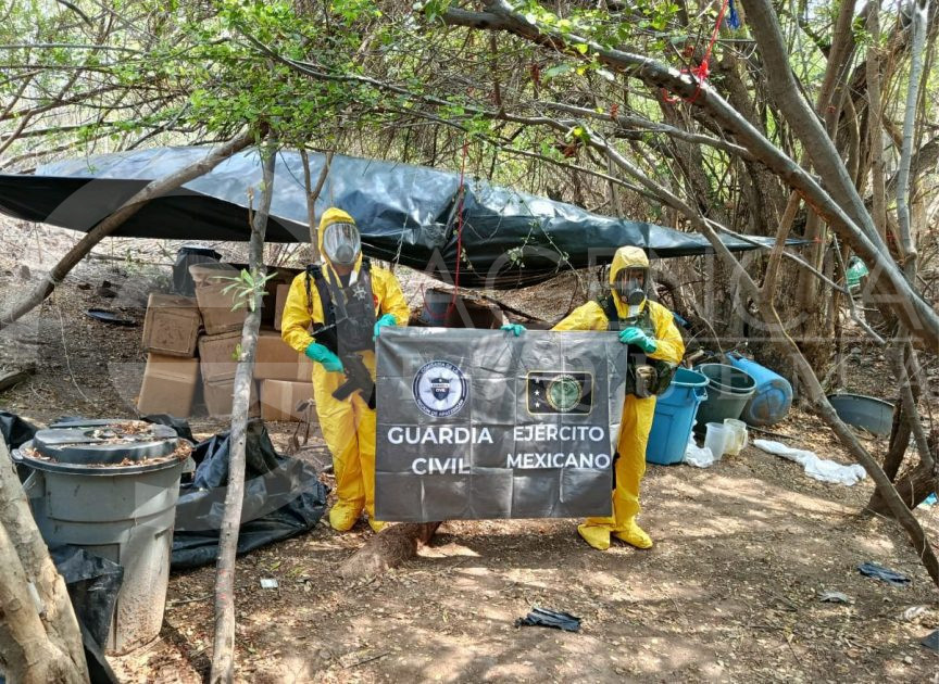En el sitio decomisaron 70 costales de sosa cáustica de 25 kilogramos, 35 tambos de capacidad de 200 litros, 6 costales de cloruro de calcio de aproximadamente 25 kilogramos, dos tanques de gas de 30 kilogramos, cuatro ollas, un reactor, dos secadoras, 18 tambos de acetona, cinco tambos de 200 litros con contenido desconocido y 50 costales hidróxido de sodio.
