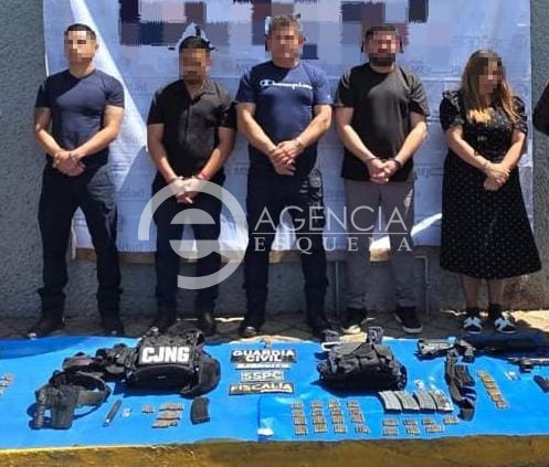 A los detenidos como presuntos responsables de hechos delictivos, las autoridades les aseguraron: Dos armas de fuego largas, tipo fusil, una pistola, 7 cargadores para los fusiles, 204 cartuchos para los rifles, un cargador para el arma corta, 17 cartuchos para .9 milímetros, un chaleco porta placas, un parche con las siglas del CJNG, una piernera táctica de material textil con diversos aditamentos, un bastón retráctil.