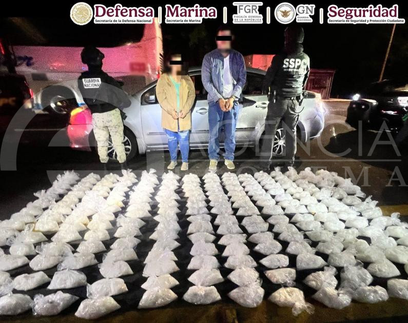 Lo asegurado fueron 215 empaques de metanfetamina con un peso aproximado de cien kilogramos, los detenidos junto con la droga fueron presentados ante el Ministerio Público correspondiente, donde definirán su situación jurídica.