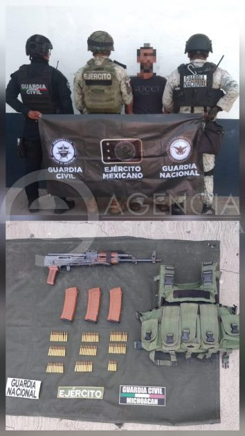Durante un recorrido por esta localidad, los uniformados localizaron a este sujeto en posesión de un fusil Pioneer Arms Sporter calibre 5.56x 45 milímetros, tres cargadores, 85 cartuchos útiles y un chaleco anti balas.