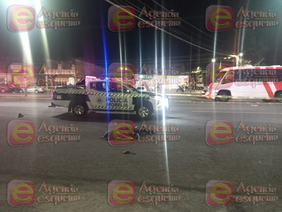 Morelia, Michoacán, 15 de abril de 2023.- Una pareja de motociclistas chocaron contra una camioneta del servicio público en la avenida Madero poniente, en la entrada a Villas del Pedregal, una de las víctimas murió y otro sufrió graves heridas.