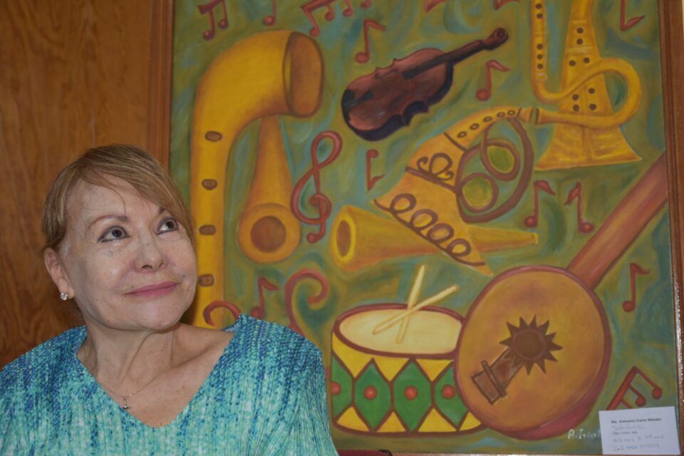 “Tengo 20 años dedicándome a las artes visuales”, señaló la docente de 80 años, quien prefiere de entre su colección un cuadro con instrumentos musicales, que ella pintó en colores amarillos, verdes y cafés, principalmente, “me recuerdan a mi padre, quien era músico”. Ella viene de cuna de artistas, algunos de sus hermanos son músicos, otro escritor y ella expresa sus saberes a través de la pintura, que muchas veces está inspirada en la infancia, pues tuvo oportunidad de dirigir un kínder.