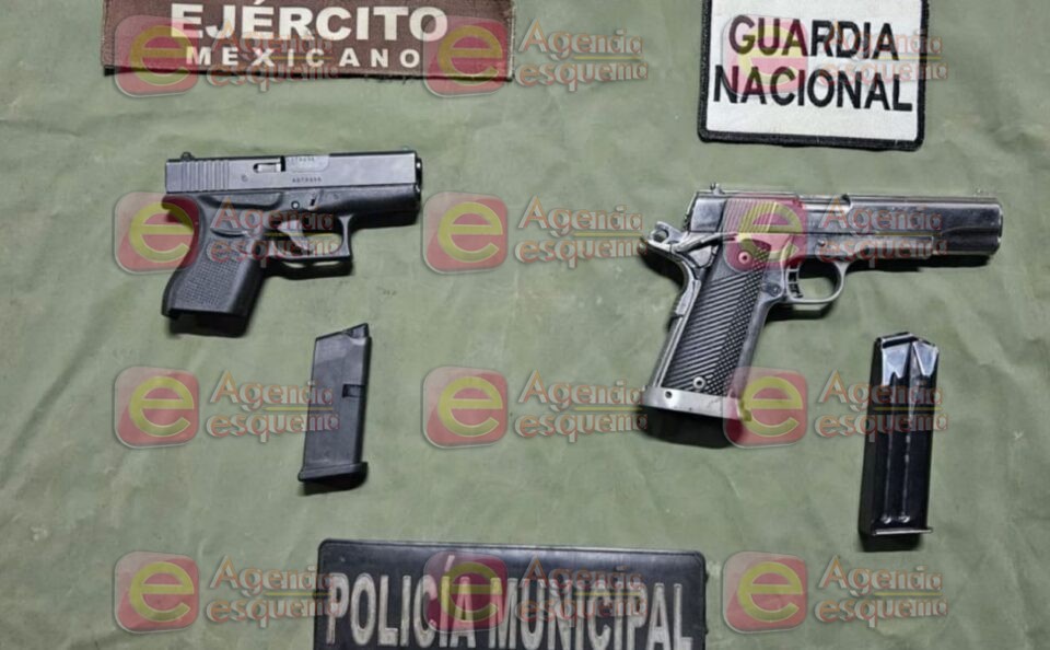 Los detenidos son Jonathan Alejandro F. H., de 25 años de edad y José Miguel R. V., de 21 años, a quienes les aseguraron una .38 súper y otra .9 milímetros, por lo que fueron puestos a disposición de la autoridad competente para los fines legales.