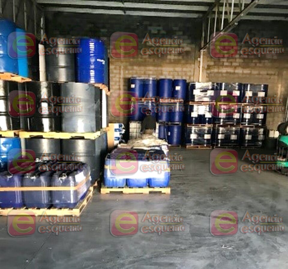 En el lugar se aseguraron tres mil 275 kilos de cloruro de calcio, tres mil 75 kilos de hidróxido de sodio, mil 960 kilos de cianuro de sodio, 525 kilos de ácido tartárico, 700 kilos de acetato de plomo, 53 mil 394 litros 810 ml de ácido clorhídrico,15 mil 604 litros 820 ml de alcohol bencílico.