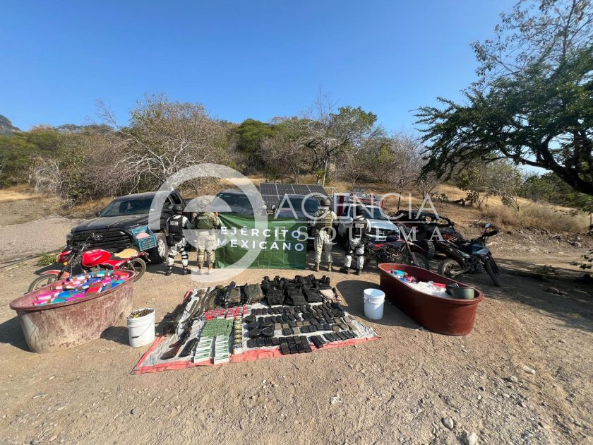 Huetamo, Michoacán, 09 de noviembre del 2025.-Narcotraficantes se enfrentaron a balazos al Ejército Mexicano y Guardia Nacional, abandonando armas de fuego, vehículos y un cargamento de droga sintética para poder evadir la acción de la justicia en diferentes direcciones de los cerros.