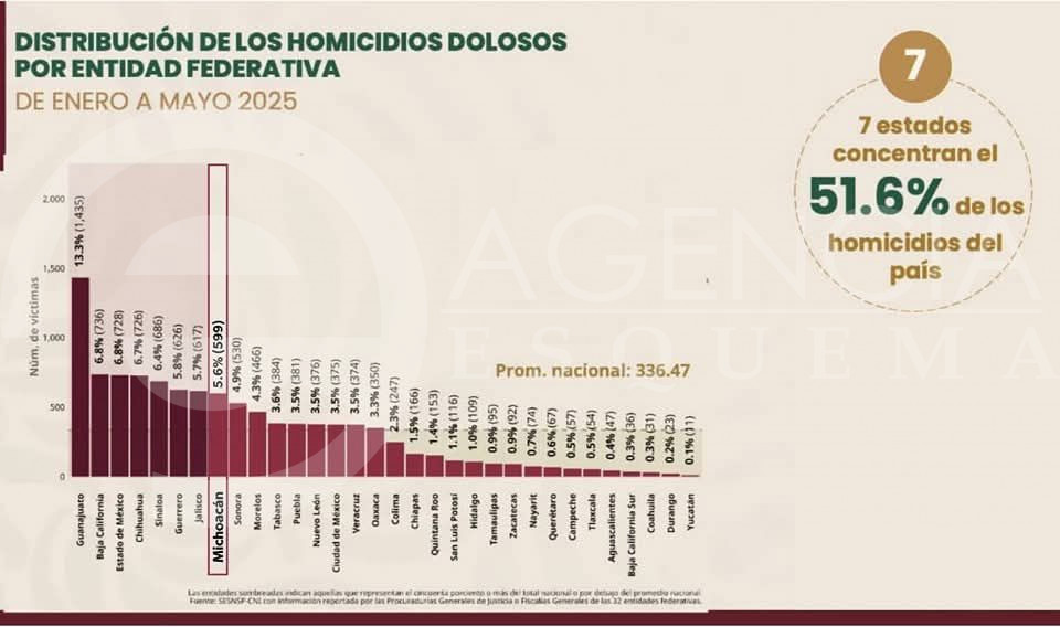 Esta medición fue realizada en los meses de enero a mayo, cabe señalar que entre los primeros siete estados de esta lista se concentra el 51.5 por ciento de los homicidios en todo el país.