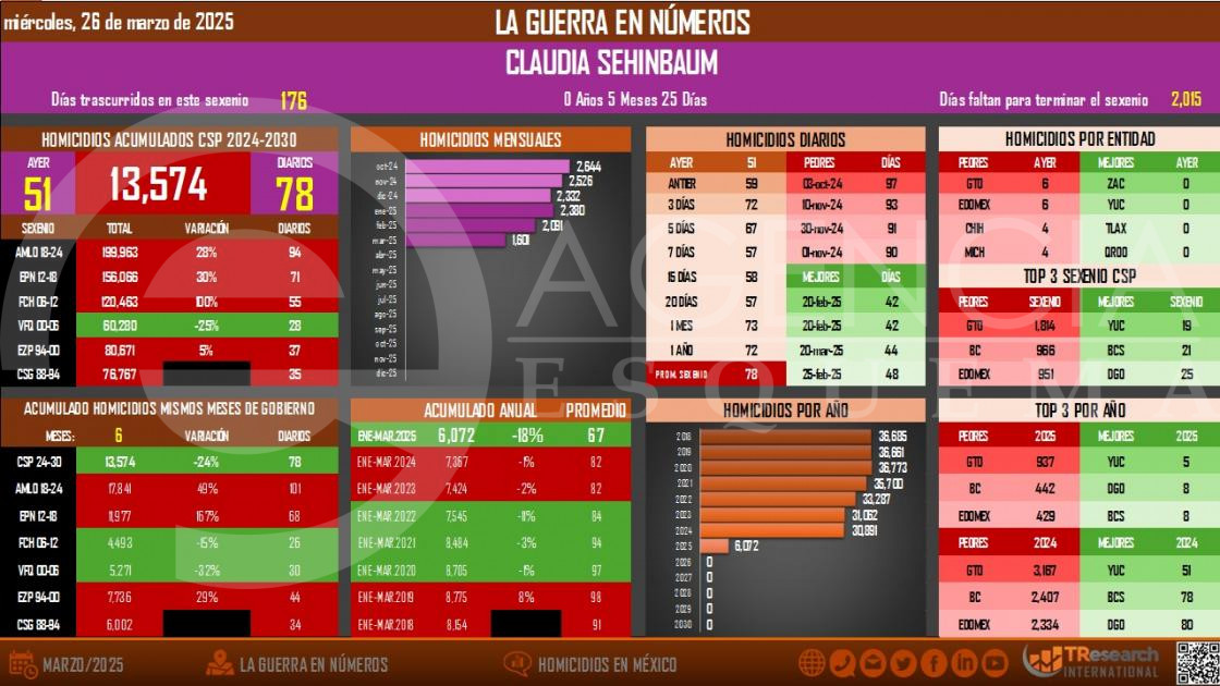 Ciudad de México, 27 de marzo de 2025.- La presidenta de México, Claudia Sheinbaum tiene 176 días en el poder, periodo en el que se han registrado al menos 13 mil 574 homicidios esto de acuerdo al informe «Homicidios en México» de TResearch.