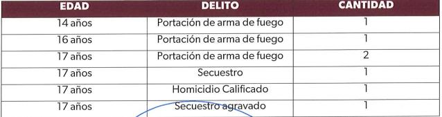 Sin embargo, presuntamente relacionado con secuestro hay otro adolescente y por secuestro agravado uno más, ambos de 17 años de edad, en tanto que por homicidio calificado es uno de 17 años.