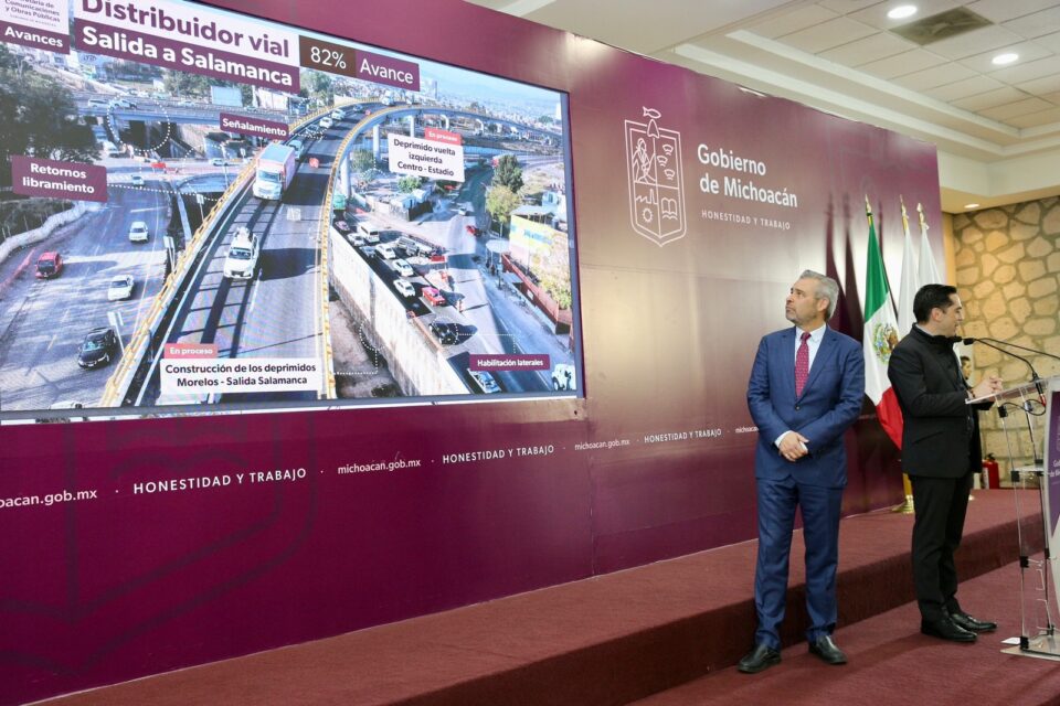 En la conferencia de prensa también se habló de los avances en las obras de los distribuidores viales de Morelia, destacando que el de la salida a Salamanca registra un avance físico general del 82 por ciento, concentrando el mayor volumen de construcción en el paso deprimido; mientras que el de la salida a Mil Cumbres, donde se trabaja en la sustitución de la carpeta asfáltica por concreto hidráulico en los carriles centrales del Periférico, tiene un 96 por ciento de avance.