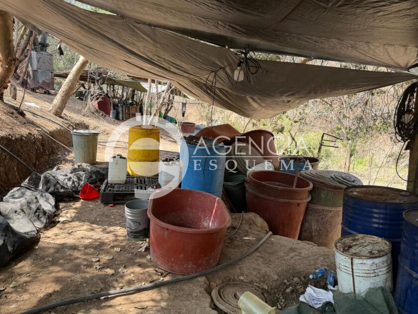 En el lugar conocido como La Guapita, las autoridades federales aseguraron reactores, 34 tinas de plástico para mezclar químicos y 15 tambos metálicos, 20 tambos de plástico con capacidad para 200 litros.
