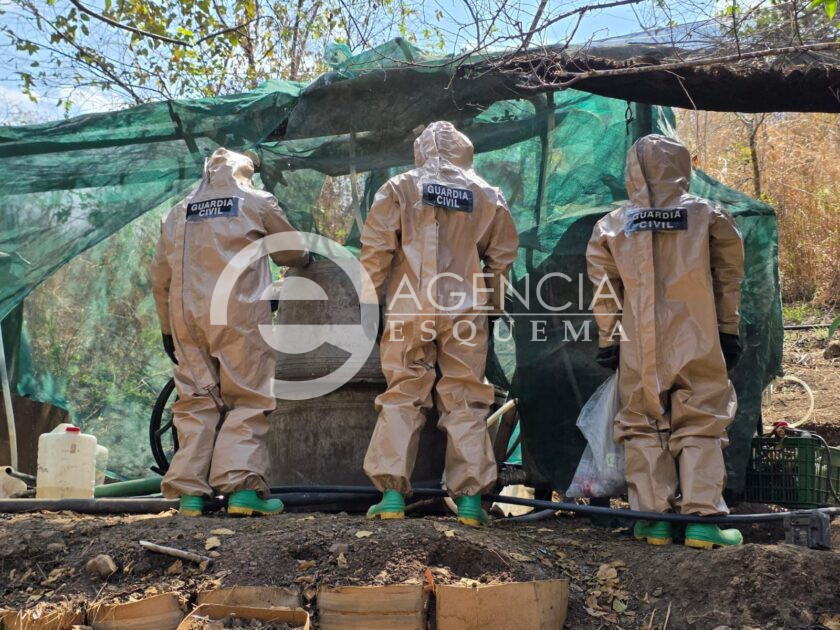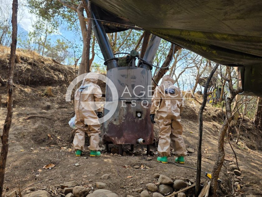 También confiscaron 50 bidones de plástico, nueve tubos acondicionados como enfriadores, cuatro cilindros de gas para 30 kilos, 30 cubetas de plástico, cuatro ollas metálicas para calentamiento de sustancias químicas y dos costales de sosa cáustica con un peso de 25 kilos cada uno.