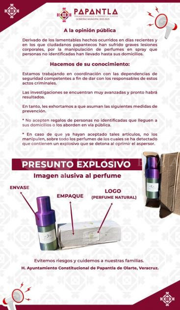 En un comunicado se informó que al menos tres personas en distintos puntos de Veracruz, han sufrido lesiones graves tras manipular alguno estos perfumes en forma de aerosol que estallan al momento de ser manipulados.