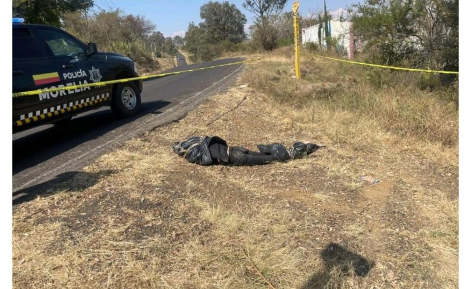 Morelia, Michoacán, 21 de noviembre del 2025.-El cuerpo de una persona envuelta en bolsas negras, fue localizado esta mañana de viernes sobre la carretera Morelia-Chiquimitío.