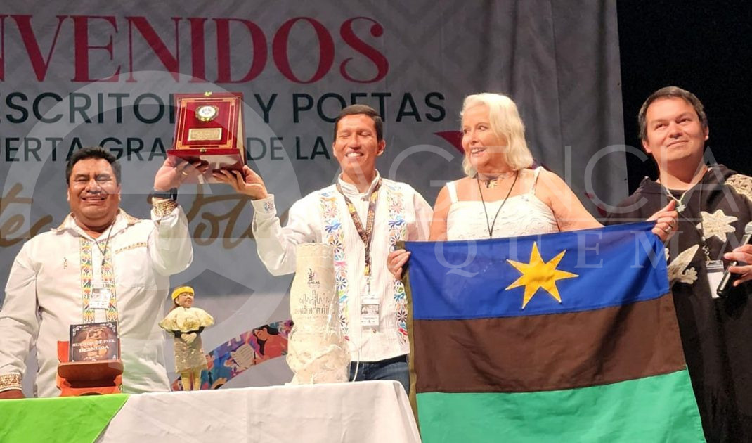 Jesús Molina recibió el premio mundial “Águila de Oro”, por su labor cultural y literaria, así como el galardón institucional de la corporación internacional de la identidad de los pueblos y la paz; en representación de Gerark Tekam Velásquez (Chile), la entregó Ana María Unhold (Argentina).