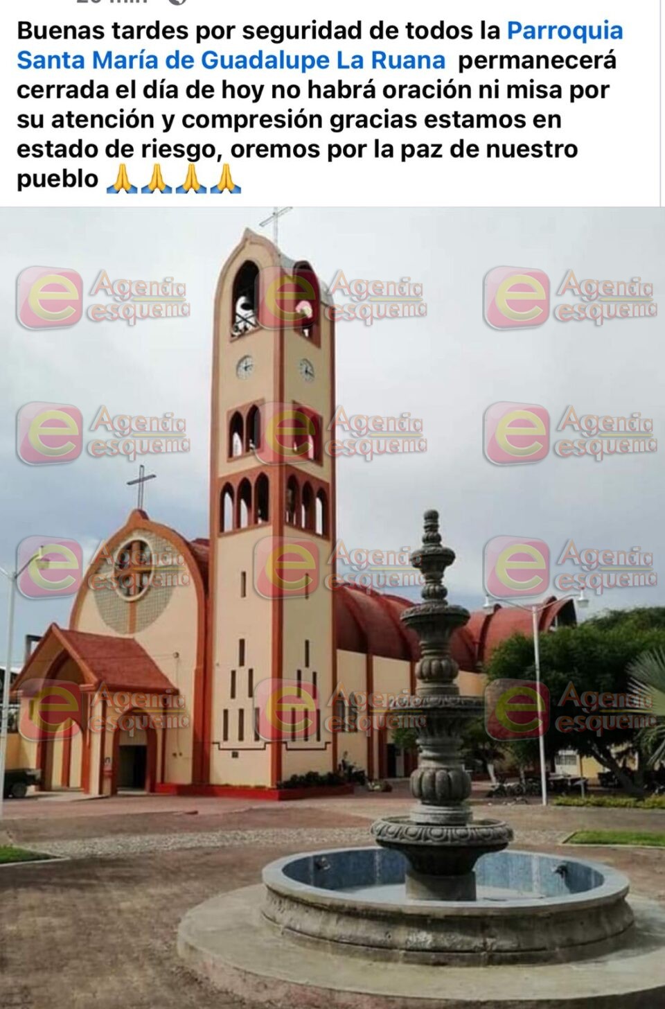 “Buenas tardes, por seguridad de todos, la parroquia Santa María de Guadalupe, La Ruana, permanecerá cerrada, el día de hoy no habrá oración ni misa, por su atención y comprensión, gracias, estamos en estado de riesgo, oremos por la paz de nuestro pueblo”.