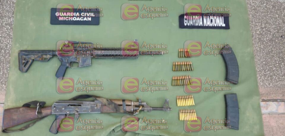 En una segunda acción, personal militar y de la Guardia Nacional localizó un vehículo en la comunidad de Las Cruces, también en Tumbiscatio. En el interior del automóvil, se incautaron tres armas de fuego tipo fusil AK-47, once cargadores y 155 cartuchos útiles calibre 7.62 X 39 milímetros, además de 100 cartuchos útiles calibre .223 milímetros destinados para fusil AR-15.